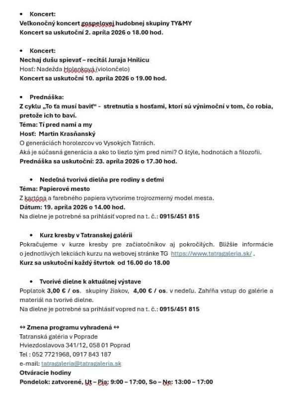 Program na mesiac apríl 2026 v Tatranskej galérii v Poprade!