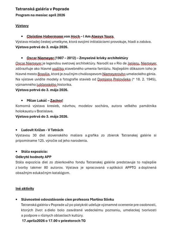 Program na mesiac apríl 2026 v Tatranskej galérii v Poprade!