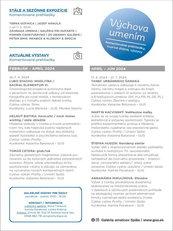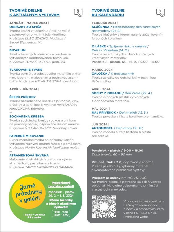 Galéria umelcov Spiša, kultúrne zariadenie Košického samosprávneho kraja, pripravila v I. polroku šk. roka 2024/2025 špeciálnu programovú ponuku pre základné a stredné školy, so vstupom na aktivity do decembra 2024 ZADARMO!