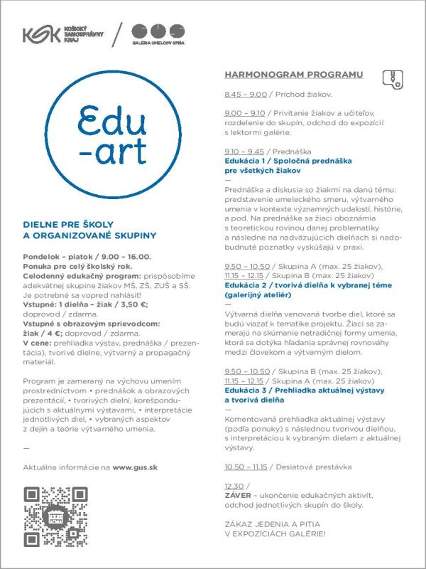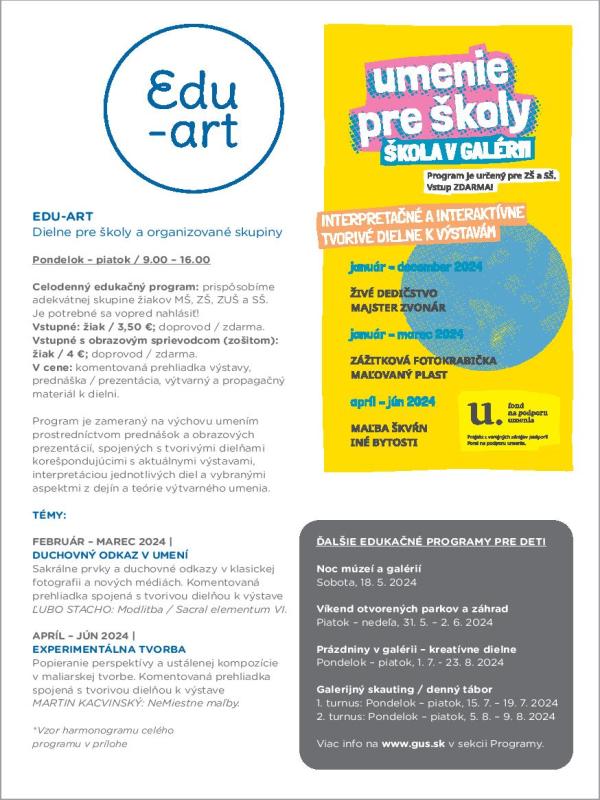 Umenie pre školy / Škola v galérii. Prezentačno-vzdelávacie aktivity s fókusom na interpretačné výtvarné workshopy sú určené pre žiakov základných a stredných škôl. Vstupné na jednotlivé aktivity je zadarmo. Na programy je potrebné sa minimálne 1 deň vopred objednať. Projekt z verejných zdrojov podporil Fond na podporu umenia.